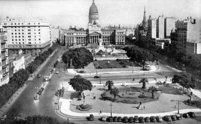 Vista panorámica de la plaza de la actualidad, a la izquierda se ve el nuevo edificio de la ex Caja Nacional de Ahorro Postal.